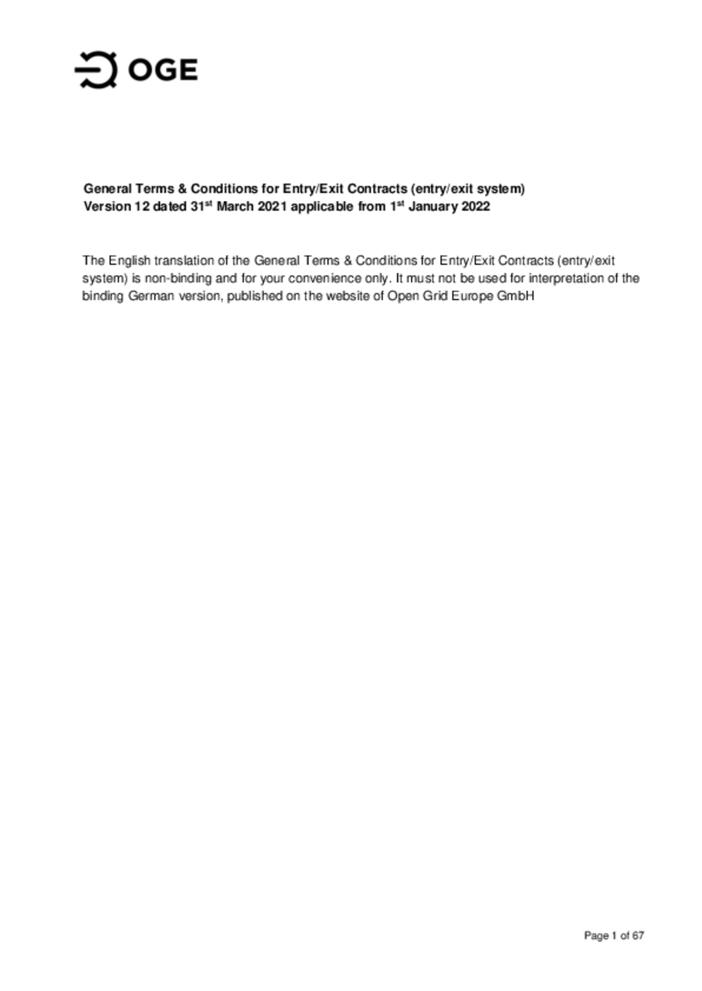 Price Sheet of Open Grid Europe GmbH for entry and exit contracts as well as internal orders in accordance with Cooperation Agreement XII in the market area Trading Hub Europe GmbH
